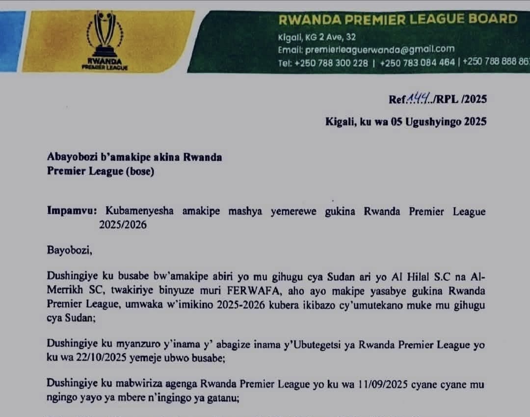 فإننا نُبلغكم بموجب هذه الرسالة أن ناديي الهلال الرياضي والمريخ الرياضي قد تم إضافتهما رسميًا إلى قائمة الأندية المشاركة في الدوري الرواندي الممتاز كأندية ضيفة، وبذلك سيُقام الدوري لموسم 2025-2026 بمشاركة 18 ناديًا.