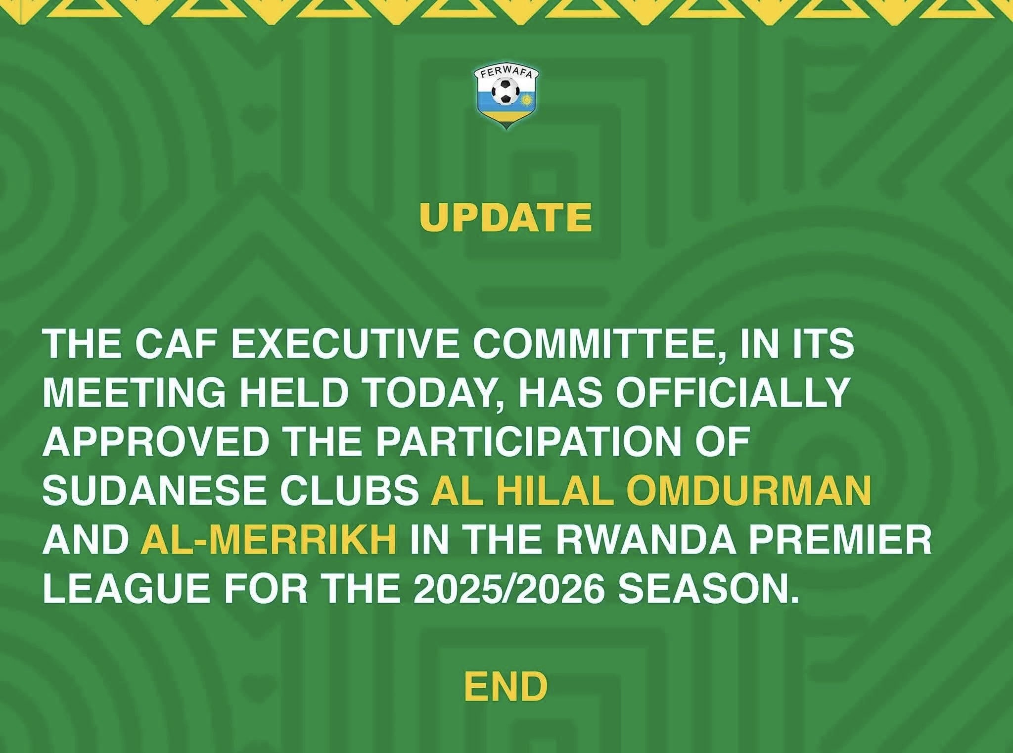 أعلن الاتحاد الرواندي لكرة القدم موافقة الاتحاد الإفريقي (الكاف) رسميًا على مشاركة ناديي الهلال والمريخ في الدوري الرواندي، في خطوة غير مسبوقة تفتح فصلاً جديداً في تاريخ مشاركة الأندية السودانية خارجياً