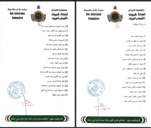 أعلنت لجنة قبول المحامين عن قرارها بإيقاف تراخيص مزاولة المهنة لـ31 محاميًا، بعد ثبوت انتمائهم أو تقديمهم دعمًا للمليشيا المتمردة، وفقًا للتحقيقات والبيانات المتوفرة لدى اللجنة.