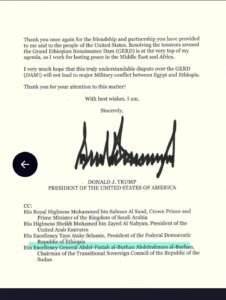 بالخطاب : الرئيس الأميركي دونالد ترامب يبعث برسالة مشتركة لرئيس مجلس السيادة عبد الفتاح البرهان والرئيس المصري عبد الفتاح السيسي والرئيس الإثيوبي تايي أتسكي سيلاسي وولي العهد السعودي محمد بن سلمان ورئيس دولة الإمارات محمد بن زايد.