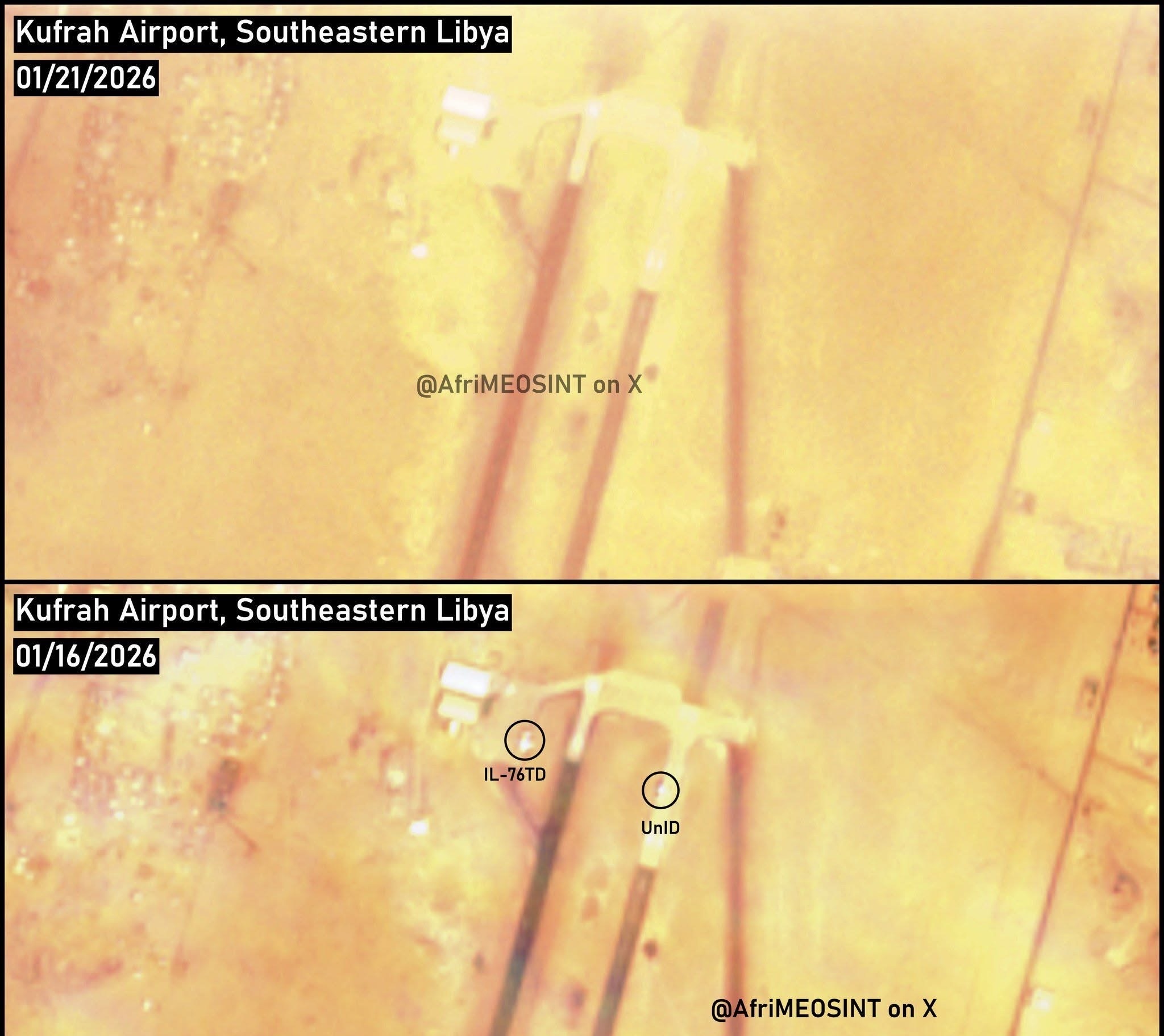 أكد خبراء الاستخبارات والرصد، أن مطار الكفرة الدولي في أقصى جنوب شرق ليبيا قد خرج عن الخدمة بشكل فعلي في الوقت الراهن، حيث أظهرت صور أقمار صناعية التقطت يوم 21 يناير غياب أي نشاط جوي ملحوظ في المطار، مع مغادرة جميع طائرات الشحن الموجودة سابقاً، بما في ذلك طائرة شحن من طراز IL-76، بحسب ما اورده الخبير، ريش تيد.