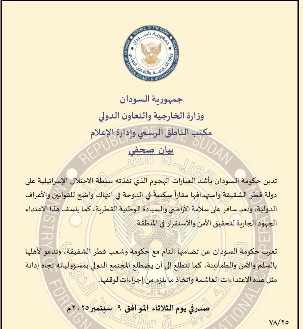 تدين حكومة السودان بأشد العبارات الهجوم الذي نفذته سلطة الاحتلال الإسرائيلية على دولة قطر الشقيقة واستهدافها مقاراً سكنيةً في الدوحة في انتهاك واضح للقوانين والأعراف الدولية، وتعدِ سافر على سلامة الأراضي والسيادة الوطنية القطرية، كما ينسف هذا الاعتداء الجهود الجارية لتحقيق الأمن والاستقرار في المنطقة.