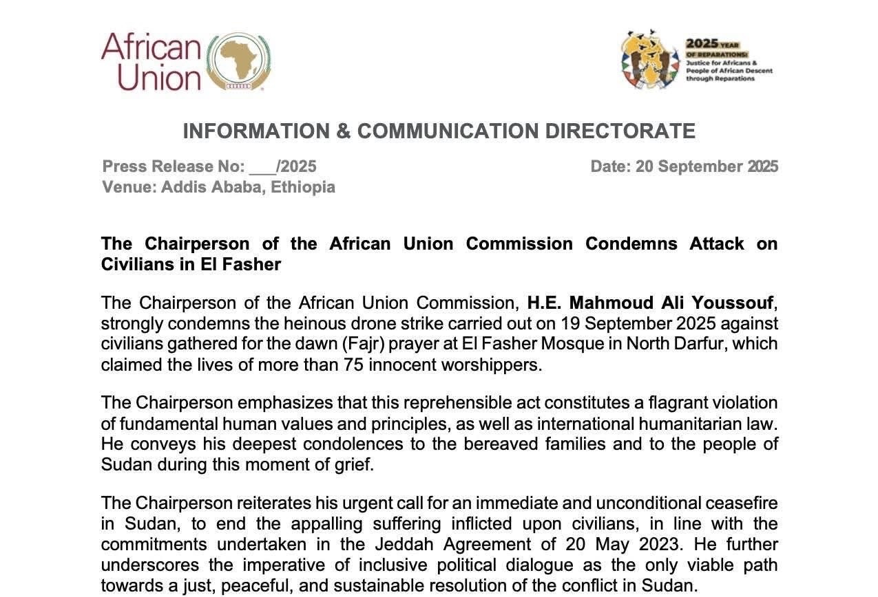 يدين سعادة محمود علي يوسف، رئيس مفوضية الاتحاد الأفريقي، بشدة الهجوم الشنيع بطائرة مسيرة الذي نُفذ في 19 سبتمبر 2025 ضد مدنيين تجمعوا لأداء صلاة الفجر في مسجد الفاشر بشمال دارفور، والذي أودى بحياة أكثر من 75 مصلياً بريئاً.